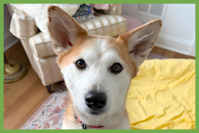 A spirited Shiba Inu mix currently in Eastampton Township, NJ, who is estimated to be about seven years old and brings a heart full of curiosity, affection, and charm wrapped in a white coat with golden patches.